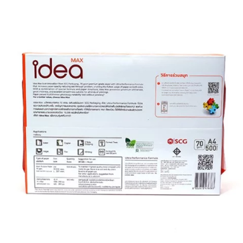 Idea A4/70 là loại giấy photo tờ rời chuyên dùng cho các máy in Laser, máy photocopy, máy in DeskJet, máy in màu, …sản phẩm được sản xuất và đóng thùng tại Thái Lan. Giấy chất lượng hàng đầu với những biểu hiện xuất sắc bên cạnh những đặc tính thân thiện với môi trường, phù hợp cho việc sao chép, in ấn với những loại mực hộp, mực in laser và cả những bản in off-set.