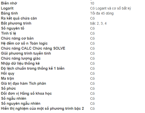 - Kiểm tra số nguyên tố có 4 chữ số - Lưu phần thương và phần dư trong phép chia - Tính năng kiểm tra đúng/sai - Thông báo vô nghiệm khi giải phương trình bậc hai - Cực trị của hàm số bậc ba - Giải phương trình 4 ẩn - Giải phương trình bậc 4 - Giải bất phương trình bậc 4 |